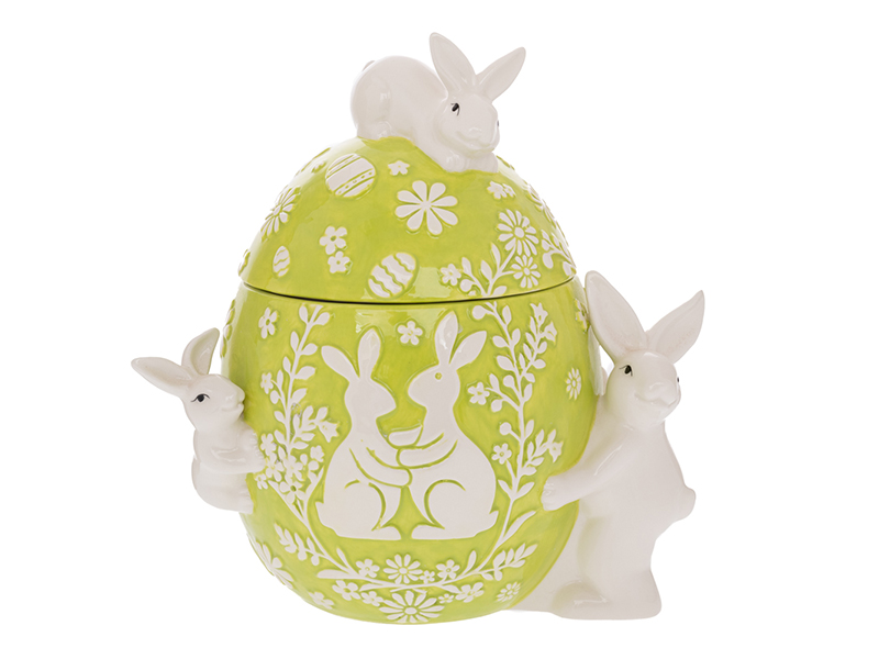 Зелена керамічна банка для печива у формі яйця з зайчиками 25x20x30 см